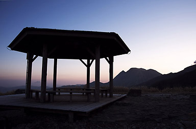 2月7日の九重連山は晴。午前7時前の牧ノ戸峠の気温は−1℃。九重連山へ向かう道々、九重スキー場では夜を徹して降雪機での雪作りが行われているようで、照明が灯っています。牧ノ戸峠に着くと、スキー場から降雪機の稼働音が聞こえてきます。7時前になると、冷え込みも穏やかな牧ノ戸峠には次々に登山客がやって来るようになります。第1展望台着後、東屋の向こうに朝焼の空を背景に日の出を待つ三俣山を望みつつ小休止。 |