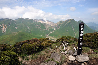 5月15日の九重連山は晴。4時頃の飯田高原の気温は4℃。昨夜は久しぶりに職場から飯田高原へ向かいます。毎度のこととはいえ、性懲りもなく爆飲して爆睡。目覚めたのはすでに4時、寒かったことも手伝いシュラフから抜け出す気も失せ、朝駆けの決意も空しく2度寝を決め込んでしまいました。(苦笑) 6時30分過ぎ朝日が注ぐ牧の峠から入山、爽快な朝の登路を快適に歩きます。初春は黄砂や霞で景色もぼやけていたのですが、このところ週末の空気は透明感も高く周囲の眺望も抜群です。沓掛山から星生山周辺まで木々が一気に芽吹いた葉を広げ、蛍光色に輝く緑が山肌を覆い始めています。鍋谷から星生山にかけて斜光線が差す斜面の緑を撮影しながらのんびりと歩きます。 西千里を抜け爽快な微風が吹く登路を快適に歩き、久住分れから御池へ向かいます。阿蘇方面や由布岳の眺望も良く、青空が広がる中で春を満喫しつつ御池を迂回し中岳へ向かいます。中岳山頂に着いた8時30分過ぎ、山頂は閑散としています。少々様子が違うな〜と思い、何気なく見ていると山頂標識が新しくなっています。先日大船山の山頂標識が新しくなっていたのですが、同じ形状の山頂標識が設置されています。 いつ頃からか、お手軽に山頂に着くことができる三俣山や中岳周辺のピークには私設の山頂標識が乱立し、朽ちた後は放置されて見苦しい状態になっていました。新設された山頂標識以外は片付けられ、雑然としていた山頂もすっきりとしています。新設された標識をよく観察すると、山名が記されている2面のうち片面は彫りがあり、もう一方には彫りがなくペイントで山名が書かれています。 しばし山頂で周囲の眺望を楽しみつつ休憩し、周囲の山を見渡すと山頂に何だか新しい山頂標識があるようです。天狗ガ城は確実に新設されている様子が伺えたので、早速確認へ向かいます。中岳と天狗ガ城の稜線の毎度の定点で徐々に緑が回復し始めた御池と久住山を撮影し、天狗ガ城山頂へ向かいます。 中岳山頂からでも確認できたとおり、やはり天狗ガ城山頂標識は新設されていました。こちらも同じように片面に彫りがあり、片面はペイントで描かれているものです。以前あった塔婆のような私設標識は撤去され、ここもすっきりと片付いています。先週の三俣山では、本峰に私設標識が乱立し見苦しくなっていましたが、折角の機会ですから、是非とも山頂に私設の造物が持ち込まれないように期待したいものです。 |