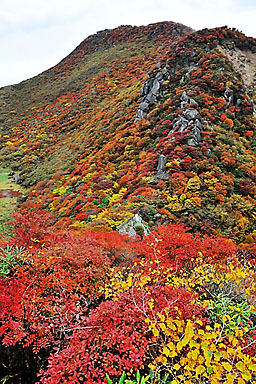 10月15日の九重連山は曇のち雨。5時30分頃の長者原の気温は15℃。14日午後から県内は雨が降り始め、帰路についた20時過ぎ一時強い雨も降り、大分自動車道の走行車線ではハンドルがとられるほど轍を水が流れていました。この雨ですから、実家の農作業も実に微妙な状況となります。予報では15日は曇のち晴、午後一時雨ということで、晴れて風が吹けば午後からは作業ができそうでもありますし、雨が降り始める時間帯いかんでは不可能ということになりそうです。ひとます、正午頃までに実家に着けば万事OKということであります。 想定外の状況で急遽山行が可能となりましたが、何しろシンデレラ山行でありますので、午前中に帰宅となると大船山は少々厳しいかも・・・・、ということでお手軽な三俣山に向かいます。5時30分過ぎの長者原駐車場は意外なほど閑散としており、大曲駐車スペースには1台も駐車していません。昨夜までの予報では曇りのち雨ということでしたから、晴れの予報が出ていた16日(日)に山行日程を変更した登山客も多かったのかも知れません。 曇っているため明るくなる時間も遅く、ヘッドランプが不要になった6時過ぎに入山。雨を残す登路のササに足下を濡らしながら、たっぷり雨を含んでズルズルに滑る登路を淡々と歩き、すがもり越へ向かいます。先週の山行記録に記載したとおり、大船山御池の紅葉が今日あたりピークを迎えているものと思われ少々心残りなわけですが、ひとまず予定外の山行ができただけでも幸いというものです。 すがもり越でのんびりくつろいでいる場合ではなく、すぐに西峰登路へ取り付きます。曇り空の下で大船山段原付近のドウダンの色付き具合は判別できませんが、それでも先週より確実に濃くなっているように思えます。西峰から本峰へ向かうと、?峰谷のドウダンが染まっています。葉の痛みもなく順調に色づいていますので、真っ赤に染まるピークは次週後半になりそうです。 本峰に着き、大鍋をのぞき込んでびっくり!思わず声をあげそうになるほど大鍋付近の色付きが進んでいます。昨夜来の雨で葉が濡れていることが影響していると思われ、とにかくうれしくなるほど鮮やかに染まって見えるます。真っ赤に染まる大船山御池とは趣が異なり、大鍋から小鍋付近はドウダンの株の中に緑を残すシャクナゲの株が点在し、黄葉も適度に混じって彩りをいっそうカラフルに見せてくれます。 本峰から大鍋に下り、大鍋を縦断し小鍋壁へ着くと、ここも見事な色付きです。色付きのピークは次週なかばあたりと思われますが、とにかく昨夜来の雨に濡れた紅葉と黄葉、シャクナゲの緑が絶妙な彩りを見せています。大船山御池の紅葉のピークは今年も見逃したものの、期せずして三俣山の紅葉が見せる錦秋の彩りに巡り会えたのは幸運でした。 |