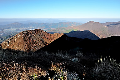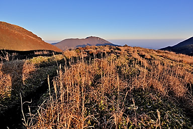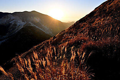 まさかここまで紅葉のピークが遅れるとは想定外で、先週末は近年秋恒例の湯布院散策と創作フレンチを堪能していたのであります。金鱗湖周辺は夕方も多くの観光客があふれ、早朝は日の出前から大賑わい。 コロナ禍で一時激減していた近隣国からのお客様も復活し、湯の坪街道は大混雑です。 近年、とみに国と国の関係は微妙な緊張感が漂っているのではありますが、民間レベルでの交流はしっかりやっていただくことが大切だと思います。私は中々行く機会がなく交流できていませんが。(苦笑) 驚愕の喧噪がいやだ〜!ということで、この秋は扇ヶ鼻と星生山西斜面の紅葉観賞でお茶を濁していたところであります。麓の駐車場は満車、さらには登山口近くの路上駐車が年々酷くなるのを、 眉をひそめ苦々しく思っているわけで、そんな喧噪に巻き込まれることなく、これからはもっと余裕を持って九重連山を楽しみたいと思う悟りの境地に達した今日この頃であります。 そうは言っても、本当にピークを過ぎたのかどうかが気になって仕方がないというのが人情でありまして、のこのこと出かけてしまうというのが実にふがいない。(苦笑)表向きは夕景観賞ではありますが、 大鍋の紅葉が終わっているかどうか気になり、確かめておかないと気が済まないというのが実情です。ということで、まずは大鍋の様子がうかがえる三俣山本峰へと向かいます。 16時過ぎに本峰に着き、大鍋をのぞき込むと、やはりネットの情報どおり、北峰斜面は紅葉のピークを過ぎ枯れ葉色になっています。まだ少し名残があるようなので、光の当たり具合次第では それなりに観賞できるかも知れません。この時刻なると誰もいないだろうと思っていたのですが、よく見ると北峰山頂付近に1人いましたね。夕景をねらって撮影中のようです。 W峰からのぞむ南峰斜面のドウダンも、彼方に望む大船山段原付近のドウダンもすでにピークを過ぎ、九重連山の山頂付近では紅葉のピークは過ぎています。 W峰で小休止の後、夕景観賞に西峰山頂台地下にある三俣山ご来光観賞の定番スポットへ移動します。風を避けることができ、ご来光でも日没観賞のどちらでもお気に入りの場所です。山の陰が徐々に伸び、 大船山を覆っていく様子を確かめ、山頂付近に夕日が当たり終える前にすがもり越へ下ります。すがもり越で大船山が完全に日が当たらなくなるのを確認してから、大急ぎで山を下り18時過ぎに大曲へ帰着しました。 大曲の気温は4℃で、入山時から10℃も気温が低くなっています。晩秋から冬、そして浅春の夕景観賞では、日没後急激に気温が低下し始めることに注意しなければなりません。