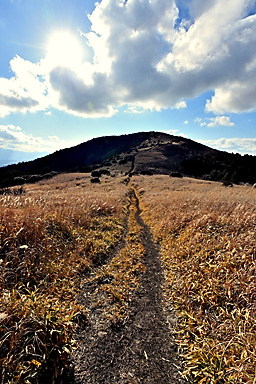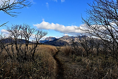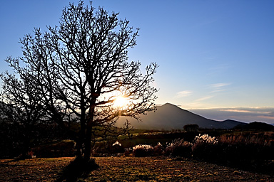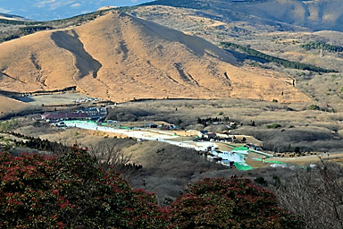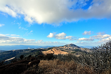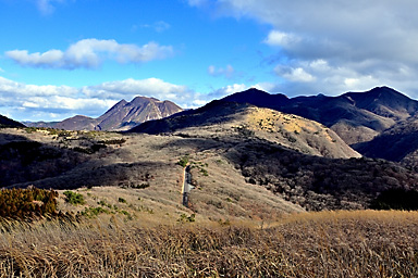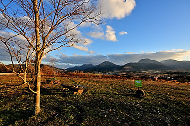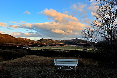 【12月19日】 12月19日の九重連山は晴。14時過ぎの飯田高原の気温は9℃。午前の仕事を終えてから、夕景観賞のため飯田高原へ直行します。雪景色の夕景撮影のロケハンのためです。とにかく厳冬期の積雪時には、 日没後には急激に気温が低下するため、お手軽に山を下れる場所での夕景観賞でなければかなり辛いのです。ご来光観賞であれば、日の出後は気温が上昇するので厳冬期でもまだましですが、 日没はそんなに甘くありません。 お手軽な場所で撮影するとなると、雪をまとった山がアーベントロートに染まる場所ということになります。扇ヶ鼻あたりが適地なのですが、1月に夕景を撮影したときも、日没後に急激に気温が低下し、 風も強く、かなり辛かったことが思い出されます。年々体力が低下し、低温への耐性も弱くなっています。しかも厳冬期の日没撮影となると、ご来光観賞とは別の不安もあります。 16時を過ぎると登山者もほとんどいなくなることを考えると、万が一の場合翌朝まで待つとなると最悪の場合命に関わることになりそうです。 そんなことで、お手軽さからいえば、すぐに登山口に戻れること、例えば沓掛山まで下って山頂付近で待機するとか、猟師山や黒岩山・泉水山あたりなど比較的アプローチが容易な場所であれば大丈夫そうです。 さらにお手軽なのは何といっても飯田高原を一望できる「ひねもす丘」です。雪景色のひねもす丘での夕景観賞は経験がないので、この冬はぜひ実現したいものであります。
