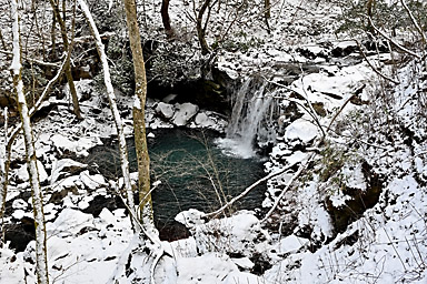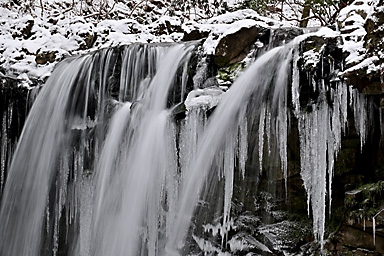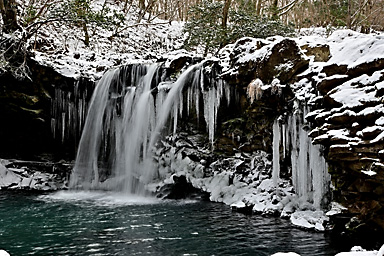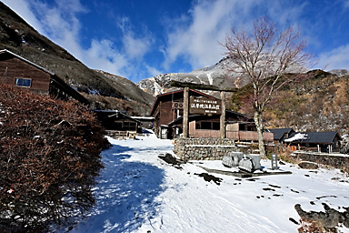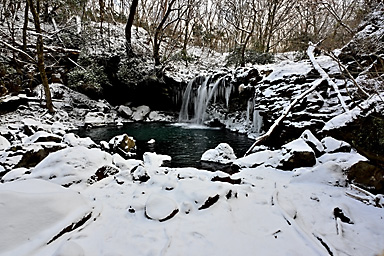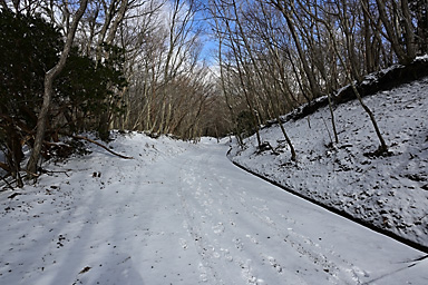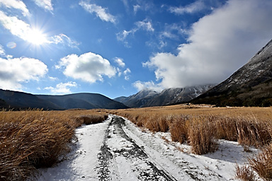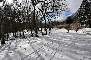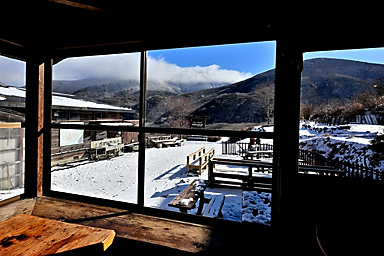 1月3日の九重連山は曇のち晴。7時の飯田高原の気温は−5℃。今年初の山行は、うっすらと雪をまとった九重連山のパワースポット、暮雨の滝であります。さすがにこの程度の寒波では完全凍結はしていないでしょうが、 それでもそこそこ凍っているのではないかという、はかない希望も込めての山行であります。もう一つの目的は、5月にプラドから入れ替えた初の軽自動車4WDのジムニーの雪上走行であります。 新品のスタッドレスタイヤと、軽4駆がどの程度雪道に強いのか、その検証はもっと雪が積もらなければ無理でしょうが、まずは雪道のさわり程度から検証です。パートタイム4WDはハイラックスサーフ以来でありますので、 マニアックな操作感も楽しみです。 九重連山への道すがら、通称四季彩ロードと呼ばれる町道へ入ると、路面には圧雪した雪がしっかりあります。今回は正月3が日でスキー場などへの行楽客が多いからなのでしょうか、まだ薄暗い時間帯から 凍結防止剤の散布が始まっています。走行しつつトランスファーレバーを操作し4WDに切り替えようとするものの、メーターの4WDのマークが点滅してうまく切り替わってくれません。 念のため一度停車し切り替えると、その後は走行中でも切り替わるようになり一安心。単に力の入れ具合が足りなかっただけのようです。(苦笑) 普通の圧雪路ですから、新品から軽く一皮むけたスタッドレスタイヤのグリップは抜群で、気持ちよく走ることができます。雪道や凍結路で怖いのは、滑って坂を上らなくなることよりも、ブレーキがきかずに止まらなくなることや、 ハンドル操作がきかなくなることで、とりあえず今回のような軽い圧雪路では全く問題なく快適に走ることができます。過信は禁物ですが・・(苦笑) 吉部駐車場からうっすらと積雪した登山道に入ります。最初の関門は木の根の登りの急登です。雪の下には大量の落ち葉があり、登りはアイゼンなしでも登れますが、下りはアイゼンが必要です。 冬の九重連山ではどこでもそうですが、登りよりも下る方が滑りやすく滑落のリスクが高くなります。軽アイゼンや最近はやり?のチェーンスパイクなどは必ず携行しましょう。 この時期にこのルートを通る登山者の多くが、凍結した暮雨の滝観賞かと思っていたのですが、先行した2人の登山者は暮雨の滝をスルーしたようで、足跡すらついていません。 雪が積もる滝つぼに下るルートを慎重に下ります。全景が見渡せるようになったものの、予想どおりさすがに滝つぼまでは凍っていません。しばし巨大な氷柱が着いた滝を観賞した後、法華院山荘へ向かいます。 坊がツル北端に抜けた10時過ぎには予報どおり青空が覗き、日が差してきました。法華院温泉山荘付近は風も弱く暖かな日だまりで、しばし談話室の日当たりが良い席を借りて小休止。 持参したコーヒーと草大福で小腹を満たしてから山を下りました。