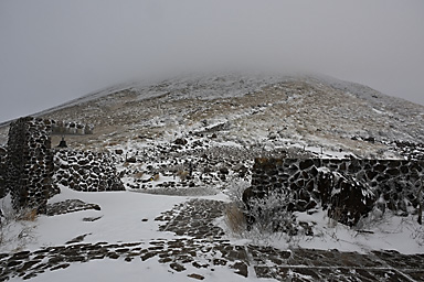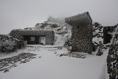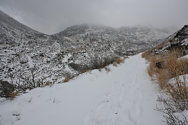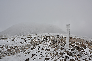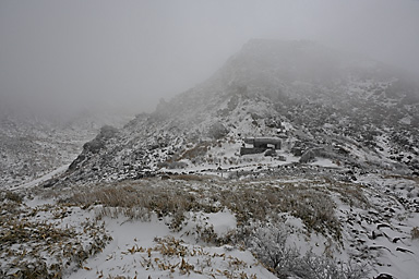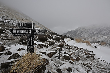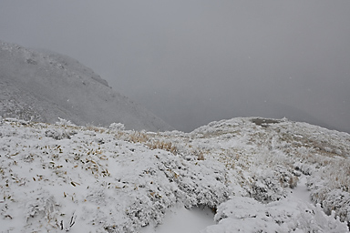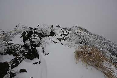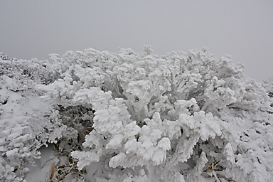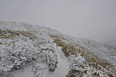 気温が高めで寒気が南下してから日が浅いためで、暮雨の滝はまだ滝つぼまで凍結してはいないでしょうし、うっすらと雪をまとう雨ヶ池も良いかも・・・などと構想を膨らませていたところ、 雲間から覗く青空に誘われうかつにも大曲から三俣山を目指してしまいました。こらえ性がないというか、もうしばらく待つという選択もあったのでしょうが、そこは人情というもの、待てないのであります。(苦笑) 大曲には先行者の車が2台駐車しており、登山道にもうっすらトレースが残っています。風が強めに吹いているのと、粉雪も降り続いているのでトレースは薄れ気味です。それでも積雪は10cm〜15cm程度なので、 トレースはなくても十分快適に歩けます。さらさらした新雪で、アイゼンがなくても登れそうでしたが、念のために6本爪の軽アイゼンを装着し、慎重に歩きます。 風が強いすがもり越の避難小屋前は風で雪が飛ばされ、ほとんど積雪はありません。すがもり避難小屋のベンチも、雪を払い落とせばまだ十分に使える程度の積雪です。すでに時刻は11時30分を過ぎ、 正午までわずかになっているので、持参したおにぎりで軽い昼食を済ませてから西峰登路に取り付きます。 今回は慎重を期して、アイゼンを装着して上りましたが、一度降った雪がほとんど溶けた後に新たな積雪があったようで、凍結した場所はなくアイゼンがなくても特に問題なく歩ける程度の積雪です。 西峰山頂下の台地に出ると、見事な霧氷が見られます。しかしながら、それどころではない強風と、横殴りに吹き付ける雪にはまいりました。一応霧氷に覆われた山頂標識までは行ってみましたが、 ガスが切れることもなく眺望は開けません。 後続の登山者はすがもり越で引き返し山を下ったようで、西峰には誰もやってきません。耐寒訓練をしているわけでもなく、これ以上待ってもガスが切れる保証もなく、ポキリと心折れて山を下ることに決定です。 吹き抜けとはいえ、こんな時はいくらかでも寒風の直撃が避けられるすがもり避難小屋はありがたいもので、しばらく待機しましたが全く天気が回復する気配もなく、早々に山を下りました。