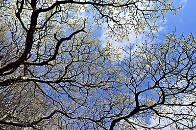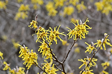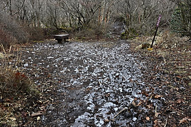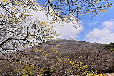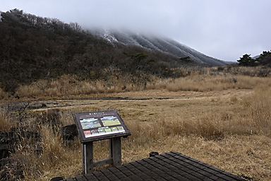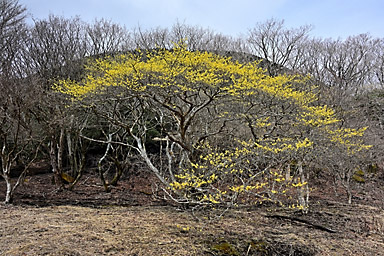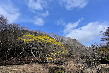 10時に長者原のタデ原木道を通って入山。前回まで2回続けて吉部から坊がツルまでのルートを選択していますので、今回は久しぶりに雨ヶ池から七曲へのルートで坊がツル北端へ向かうことにします。 登山道の水たまりには氷が張り、周囲は霜柱で真っ白くなっています。天気の回復は遅く、中々晴れてきません。雨ヶ池付近はガスに覆われ、周囲の山には霧氷が確認できます。 小休止の後、雨ヶ池先の枝道から七曲がりへのルートへ入ります。利用されている登山者もそれなりにいるようです。ガイドテープや踏み分けもしっかりしているので、迷うことはないでしょうが、 おびただしい数の鹿の糞があちらこちらにあふれ、鹿の通り道(獣道=けものみち)にもなっているためでしょうか、幾筋もの分岐が至る所にあり、ガイドテープを見逃さないように慎重に歩く必要があります。 杉林の中を通るつづら折りの急坂を下ると、鳴子川西岸の暮雨の滝経由のルートと合流し、坊がツル北端に出ます。木片に記された表示がある場所が七曲です。 雨ヶ池からですと、九州自然歩道の道なりに登山道を下り坊がツルへ抜けてからマンサクの古木がある場所まで来るより、いくらかは距離を稼げるようです。 2週間前はつぼみを膨らませ、切れ間から黄色い花弁を覗かせ、先週は開花かを確認しています。そして今回はほぼ満開になっているマンサクの古木とご対面。3週続けて訪れたのも、 春を告げるマンサクの開花を待ちわびているからでありまして、青空に映えるマンサクの花を見上げると、本当に春の訪れを実感できます。 しばし雲が切れ、青空が覗くようになるのですが、再び雲に覆われてしまします。満開のマンサクを眺めつつ昼食を食べしばし待機します。天気は徐々に回復し、雲が切れ青空が覗く時間が長くなってきます。 まだ風は冷たく、しっかり着込まないと寒さを感じます。13時前まで待機し、青空と平治岳山頂の霧氷とマンサクのコラボを撮影してから山を下りました。 タデ原へ下ると、登山道から木道へ入る場所には翌日の野焼きに備えて通行禁止の刑事が用意されていました。木道には消火用の水を入れた小型のローリータンクも置かれています。 いよいよ明日は野焼きのようです。枯れ草に覆われたタデ原が、野焼きによって漆黒に代わると、いよいよ本格的な春もすぐそこまで来ているのを実感します。