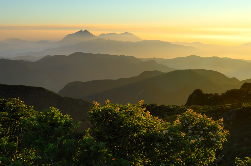 明け行く九重連山 −久住山頂にて−(2003年9月) (Nikon D1x,800x531pixels)・・・84KB